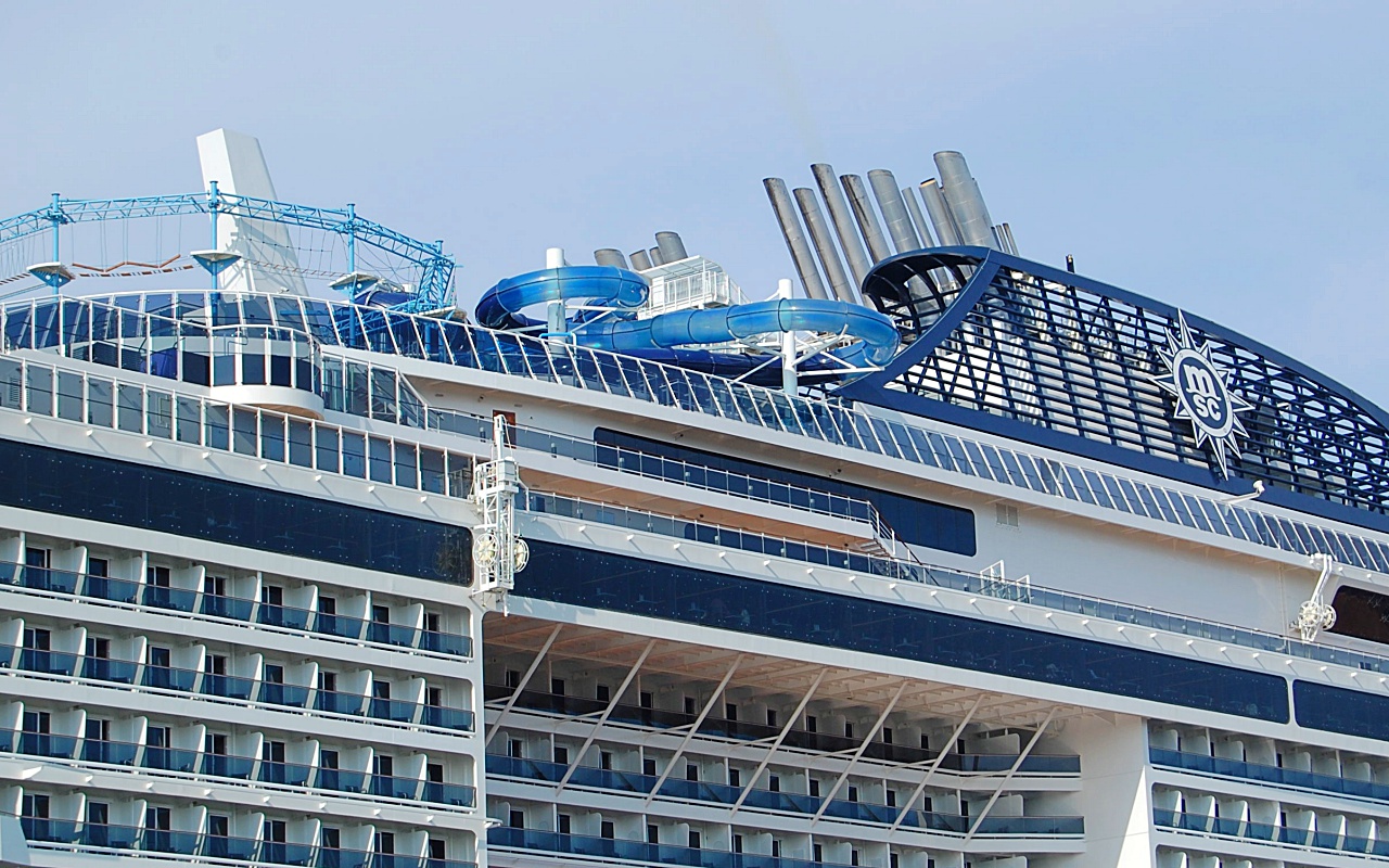 - Rutschen mit Meerblick: Der Aqua Park kann sich sehen lassen. Für Nervenkitzel sorgt eine Wasserrutsche, die über den Rand der Bordwand hinausragt © Melanie Kiel