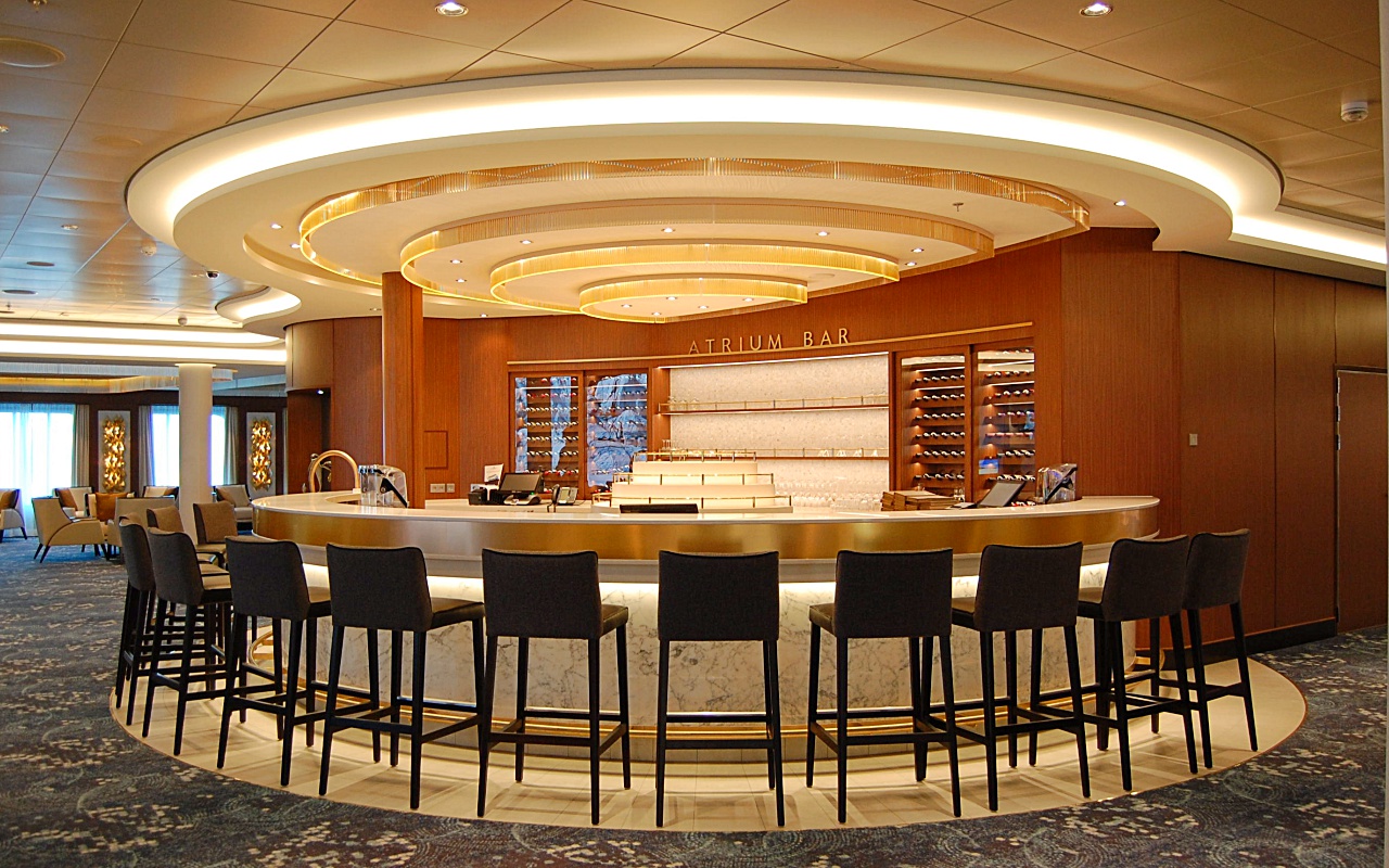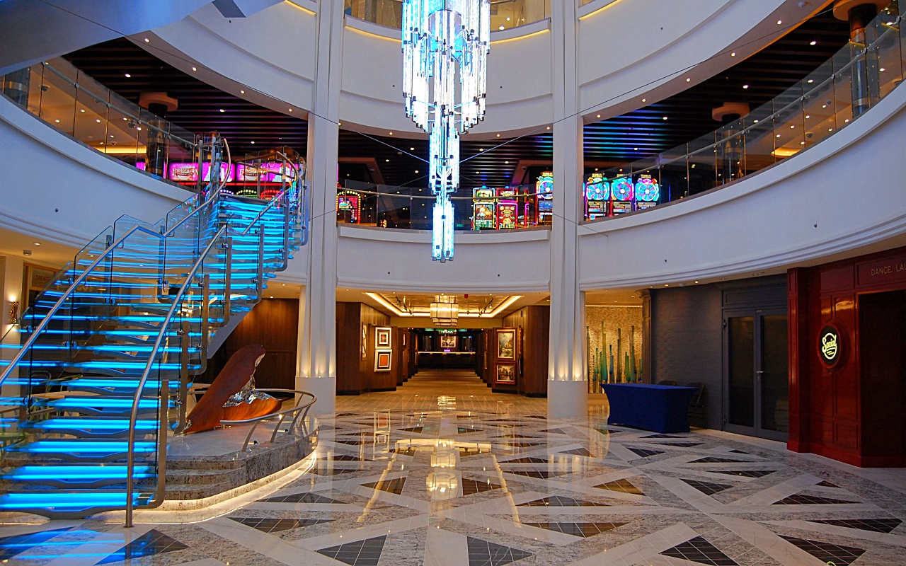 - Im Herzen des Schiffes befindet sich der 678 Ocean Place. Über dem offenen Atrium schwebt ein eindrucksvoller Leuchter, dessen Farben beständig wechseln. Das Atrium erstreckt sich über die Decks 6 bis 8 © Melanie Kiel