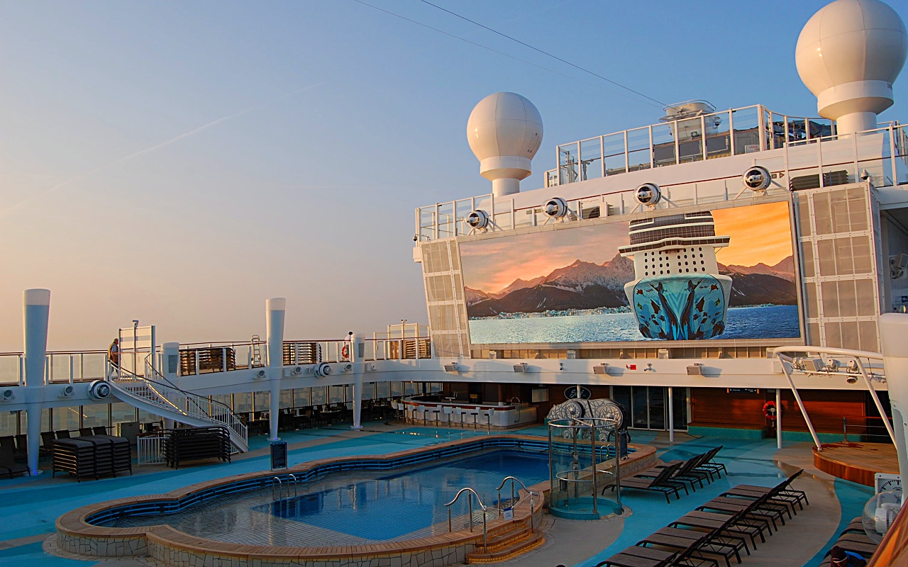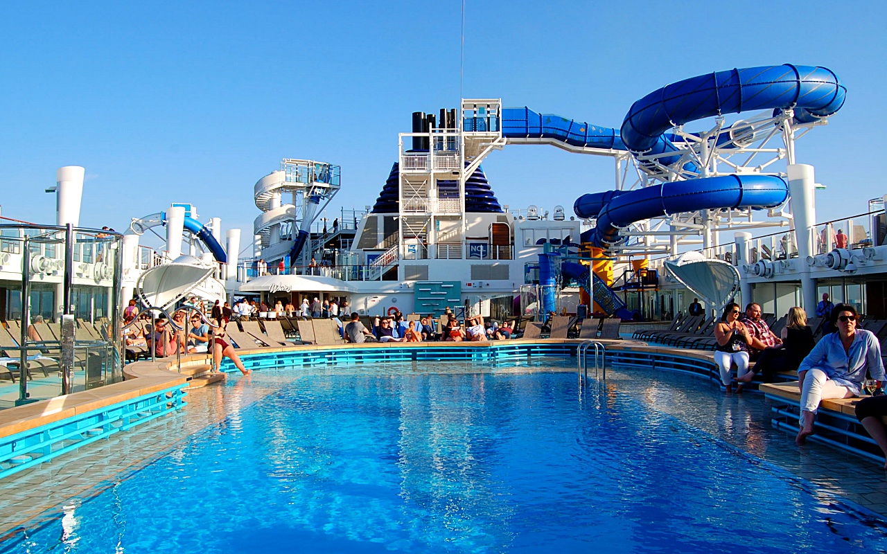 - Der Pool auf dem Sonnendeck. Im Hintergrund sind die Rutschen im Aqua Park zu sehen © Melanie Kiel