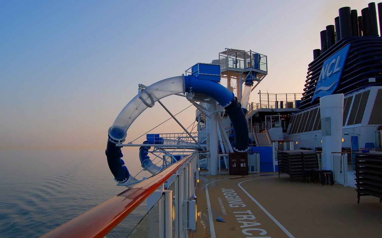Bei so viel gutem Essen und den vielen tollen Bars könntet ihr mich nach einer Woche an Bord nach Hause kugeln. Damit das nicht passiert gibt es etliche Sport- und Fitnessmöglichkeiten an Bord. Von den Pools und vielen weiteren Aktivitäten wie Minigolf, Laser Tag und Rennbahn mal ganz abgesehen. Ja, ihr habt ganz richtig gehört – es gibt eine Rennbahn -die größte Kartbahn auf See. Muss man nicht haben, denkt jetzt sicher der eine oder andere, aber wer vom Streckenrand zuschaut und sieht, wie begeistert wir Runden gedreht werden – und wie groß der Andrang am Startpunkt ist – wird eines Besseren belehrt. Ich persönlich bin vom Laser Tag begeistert. Hier bin ich mindestens genauso aufgeregt, wer hinter de nächsten Ecke der Raumschiff-Kulisse lauert und getroffen zu werden, wie beim Rutschen auf dem Aqua Racer, der mich ein Stück über die Bordwand und damit das offene Meer befördert.