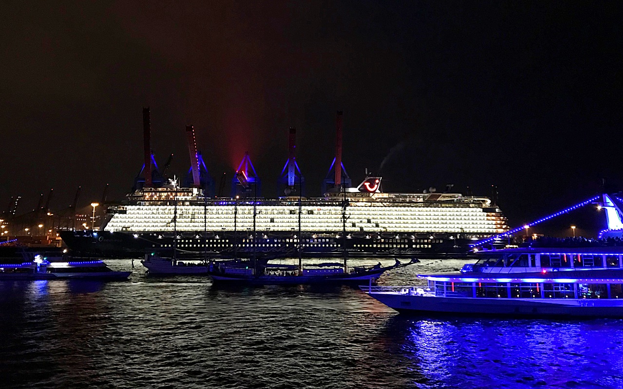 Gegen 24 Uhr setzte sich der TUI Cruises Neuling mit über 2.500 Gästen an Bord in Bewegung. Vor den Landungsbrücken ertönte drei Mal das Schiffstyphon, bevor das Kreuzfahrtschiff zur Tauffahrt in Richtung Nordsee aufbrach.