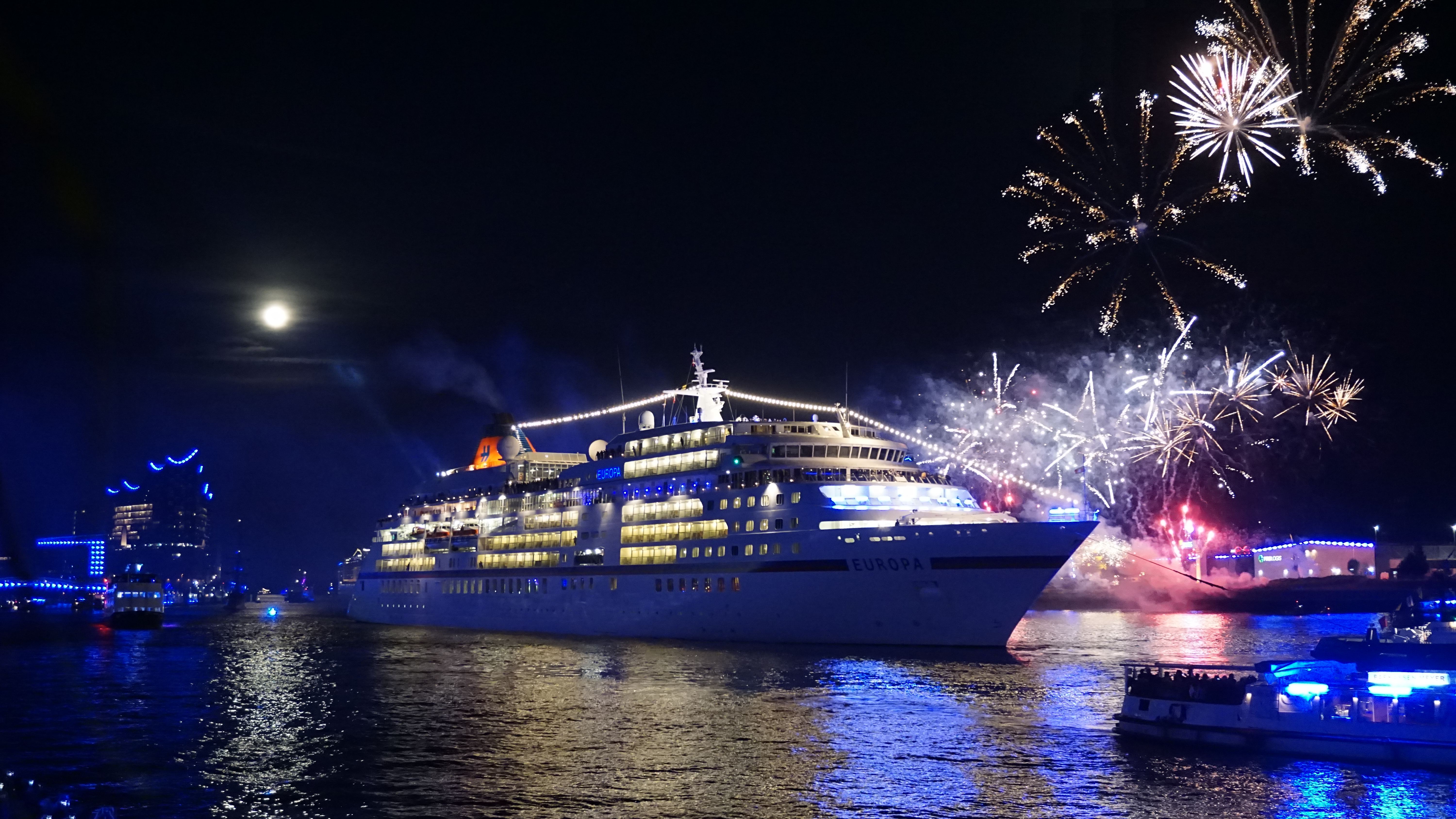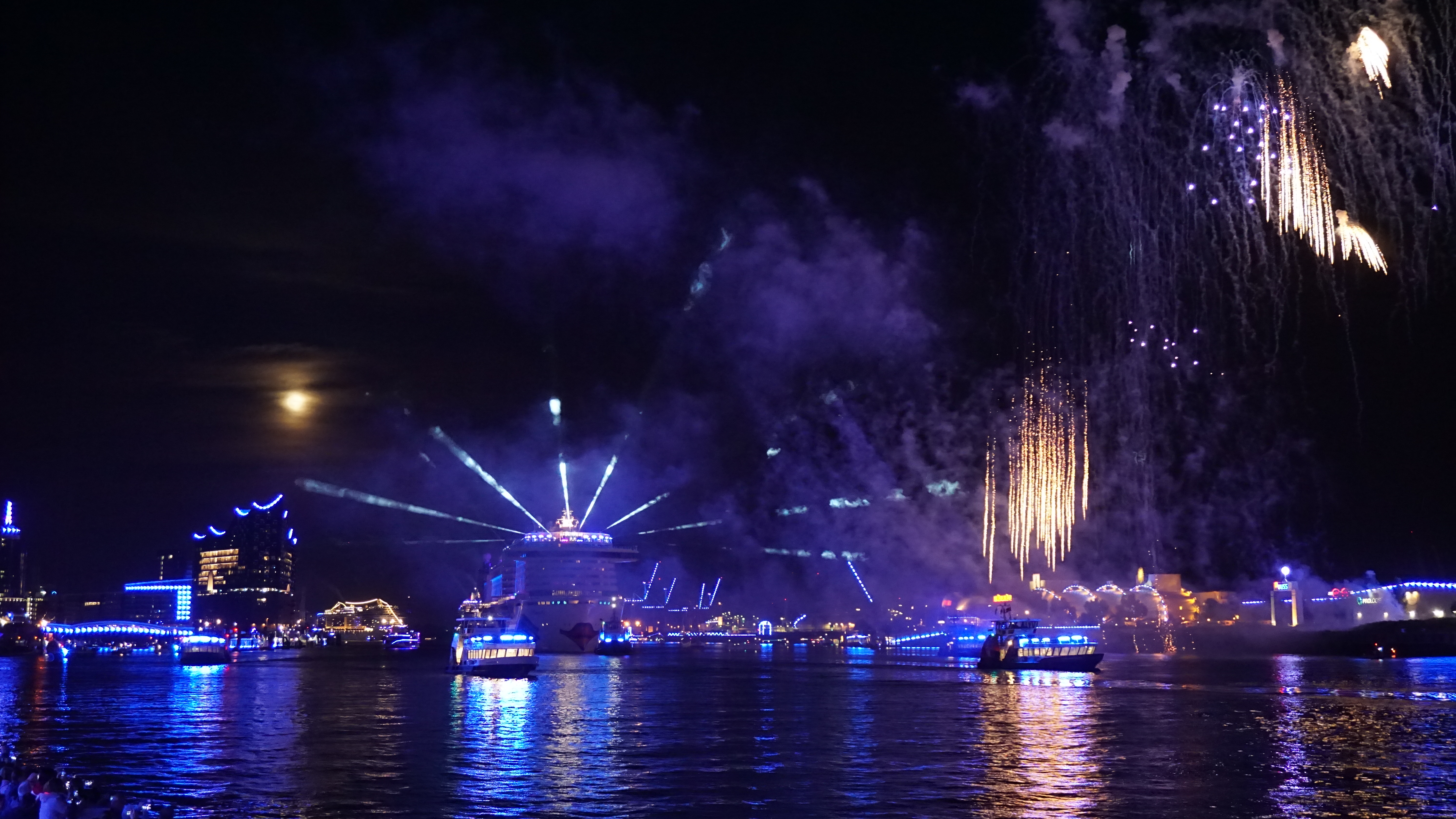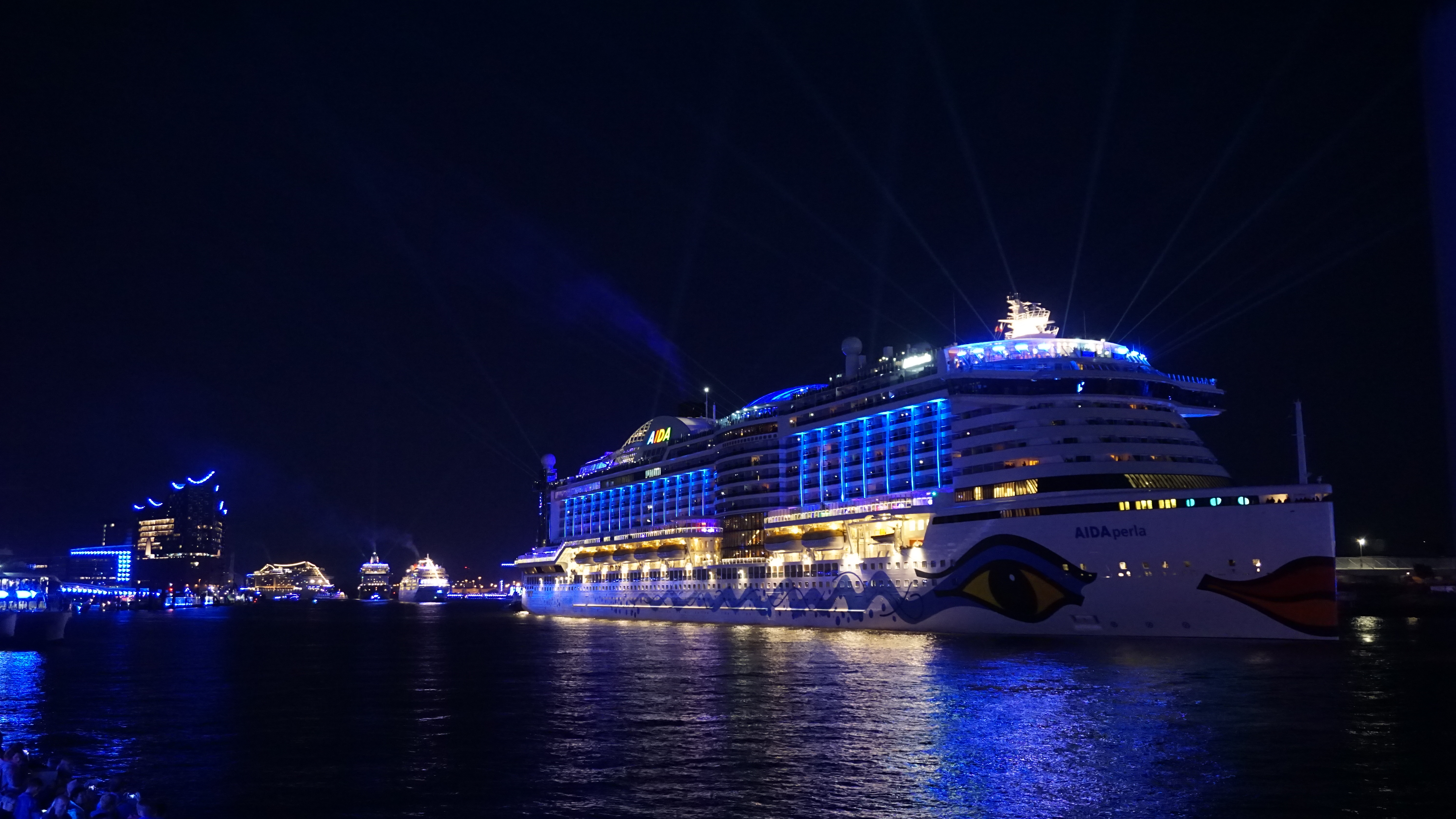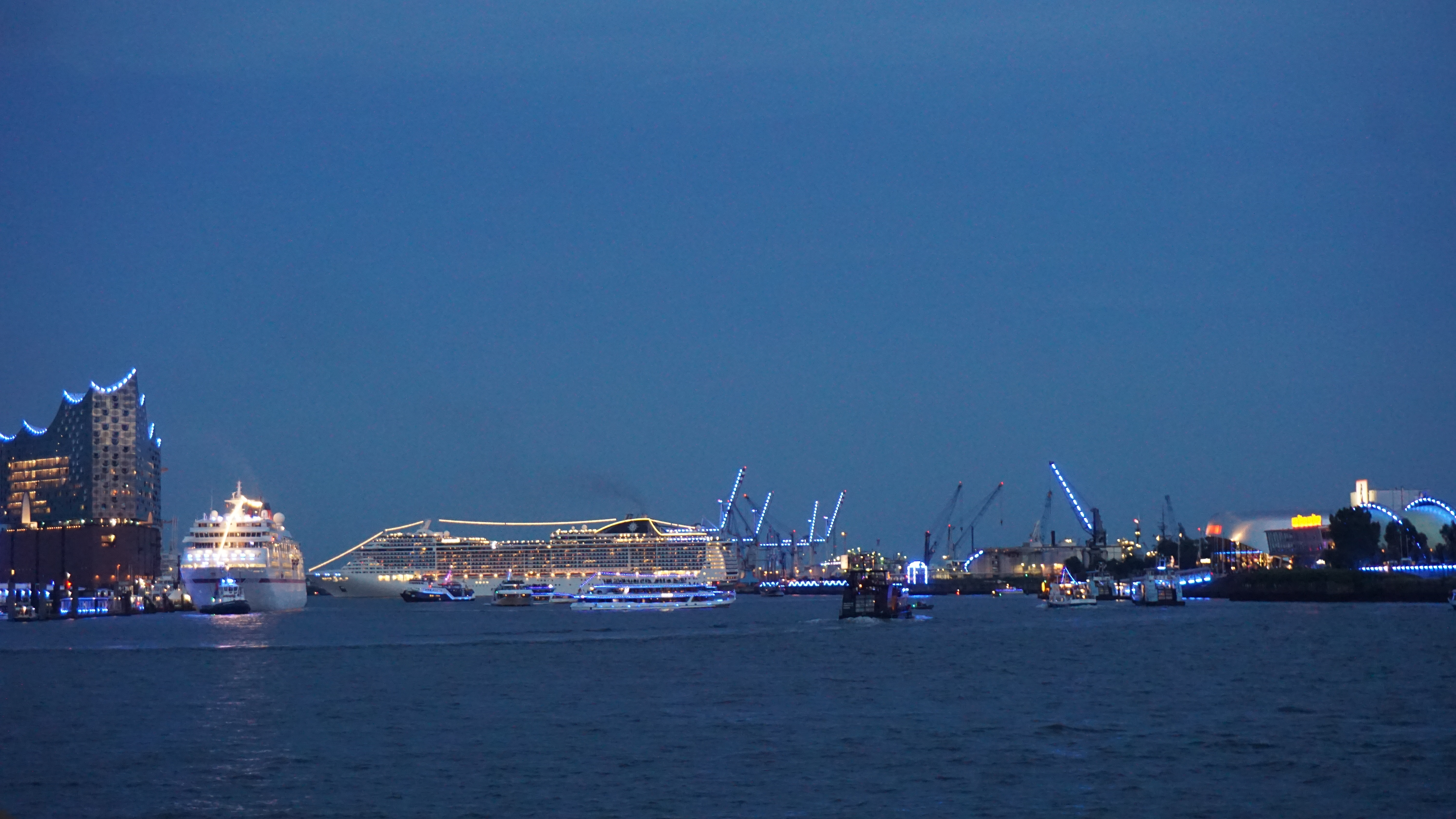 AIDAperla führte die Parade an, gefolgt von MS Europa, Mein Schiff 4, dem World Explorer und der MSC Preziosa. Ab 20 Uhr bereits konnten die Besucher die Manöver verfolgen, mit denen die Schiffe ihre Startpositionen im Hafen einnahmen; pünktlich um 21.15 Uhr begann die Parade vor der Kulisse des durch den Blue Port Hamburg blau illuminierten Hafens.