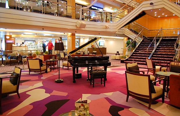- Eyecatcher im Zentrum des Atriums auf Deck 5 ist ein schwarzes Piano © Melanie Kiel