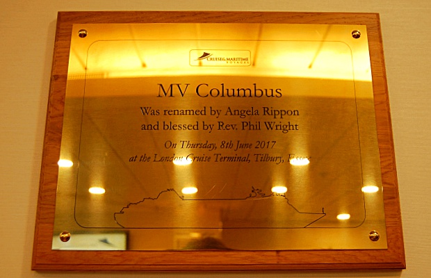 - Renaming-Plakette – am 8. Juni 2017 wird die MS Columbus in London auf ihren neuen Namen getauft © Melanie Kiel