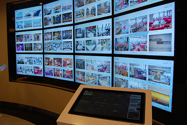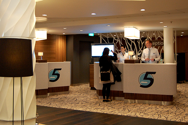 Wer genau hinsieht, erkennt bereits äußerlich kleine Unterschiede. Die großen Lettern auf der dunkelblauen Bordwand sprechen bei der Mein Schiff 5 verheißungsvoll von „Faszination“, „Ruhe“, „Harmonie“ und „Lebenslust“. An Bord angekommen werden Gäste nicht enttäuscht: Die Einrichtung kann man ohne Frage als harmonisch betiteln. Und stylisch. Mal dominieren dezente Töne, mal farbenfrohe Details. Vor allem aber die  TUI-Farbe Aqua ist allgegenwärtig – vom Arena-Tartan, über den Joggingparcours bis hin zur TUI-Bar-Beleuchtung oder der Einrichtung im Atlantik-Mediterran. An jeder Ecke gibt es kleinere oder größere Kunstwerke zu entdecken. Die Rezeption ist neu gestaltet und wird umrahmt von der Nespresso Bar und der Thalia Leselounge, einer weiteren Neuerung an Bord.