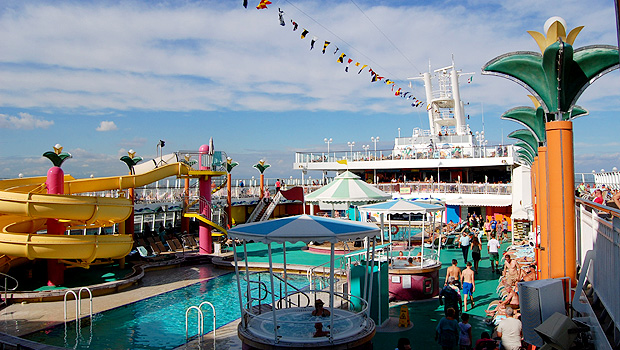 - Pool, Wasserrutschen, Jacuzzis und Kinderpool sind Lieblingsplätze auf Deck 12. Auch die Topsiders Bar & Grill befindet sich dort